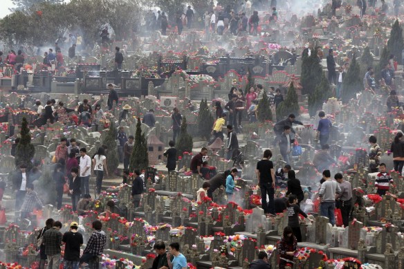 Veglegar fórnarathafnir forfeðrunum til heiðurs eiga sér langa hefð í Kína og segir sagan að gjafir til hinna látnu hafi verið orðnar svo íburðarmiklar og framferðið svo tímafrekt að keisaranum þótti nóg um. Fyrir 2500 árum síðan skipaði hann því svo fyrir að athafnirnar skyldu héðan í frá takmarkast við einn dag á ári. Æ síðan hefur qingming hátíðin verið haldin í heiðri. Miðað við það sem við höfum lesið og heyrt í spjalli við heimamenn fer fjölskyldan venjulega öll saman að grafreitnum. Þegar búið er að snyrta leiðið og leggja á það blóm, gjarnan tryggðarblóm (krýsantema), er komið að því að reiða fram uppáhaldsrétti hins látna. Víni er hellt í bolla og skammtinum í bolla grafarbúans er hellt yfir jarðveginn. Síðan borða gestirnir matinn við leiðið rétt eins og um lautarferð sé að ræða.